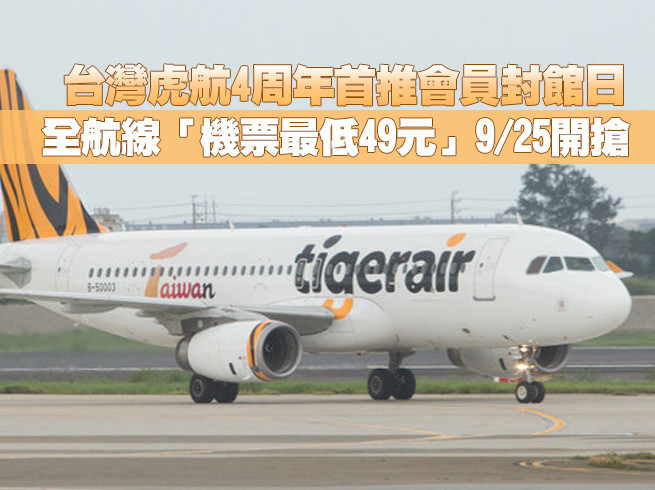 台灣第一且唯一的低成本航空台灣虎航自2014年9月26日開航至今將屆滿四週年,為歡慶開航四週年並感謝tigerclub會員的支持,於2018年9月25日上午10:00起至晚間23:59止,祭出首次的tigerclub會員限定封館日,有機會購入單程未稅NT$49、NT$499或NT$949的優惠票價!
