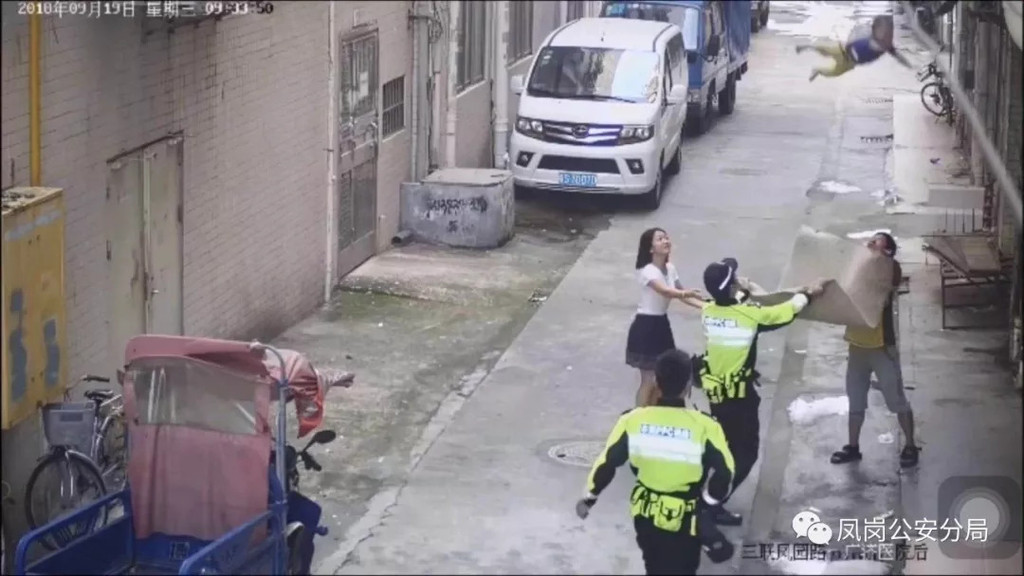 東莞19日上午有個小孩趁家長疏忽爬出窗戶,懸掛在2樓高的電線桿上,只要風大點就有可能墜樓。好在樓下的外賣員與鳳崗鐵騎大隊隊員(騎摩托車巡邏的交警)撐起毯子做緩衝穩穩接住他,事件才平安落幕。但影片內完全沒看見家長身影,因此網友大罵「這時候家長跑去哪了」。