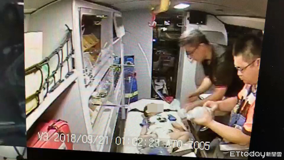 ▲警消在救護車上為男嬰初步急救。(圖/記者宋德威翻攝)