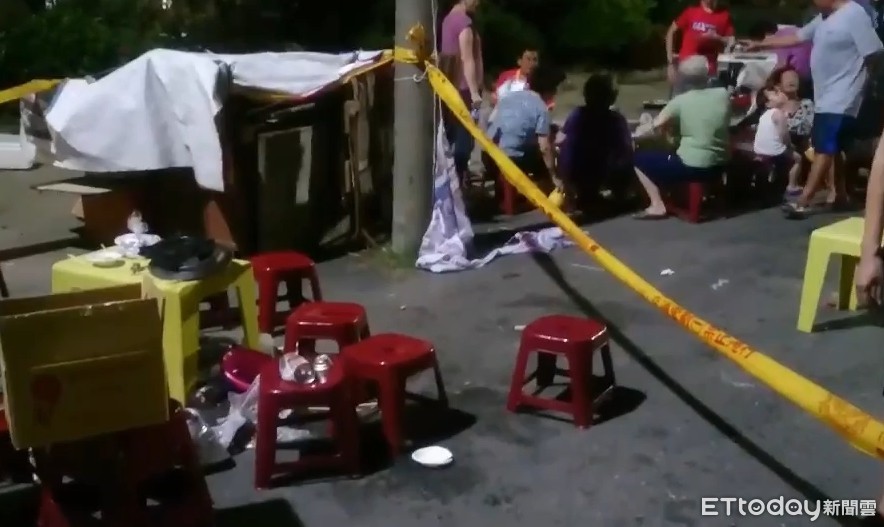 ▲台南仁德區二空路與和愛街交叉路口之社區中秋烤肉晚會,驚傳發生瓦斯罐爆炸意外,現場一片狼藉。(圖/記者林悅翻攝,下同)