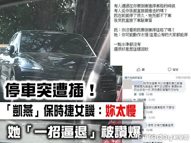 一名女網友21日在「爆廢公社」表示,自己在路邊要倒車停進車格時,卻遇到一名駕駛保時捷「凱燕」的女駕駛從後面突然插進車格,讓她氣得下車敲車窗理論,沒想到對方竟然回說「你可能動作太慢,這是公有的大家都能停」,讓她氣得po網怒罵「一點水準都沒有!」