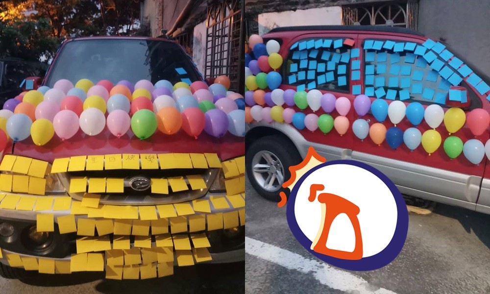為了給另一半驚喜,許多人都曾花心力準備工作上,一名女網友表示,她花了約2個小時,用嘴巴吹了100個左右的氣球,就是為了要準備生日驚喜。這些氣球則被她貼滿男友的車,除了七彩的裝飾之外,女網友還在車窗上黏便利貼。其他人紛紛笑說「應該會很驚,但有沒有喜就不知道了」、「感覺比較像驚嚇」。