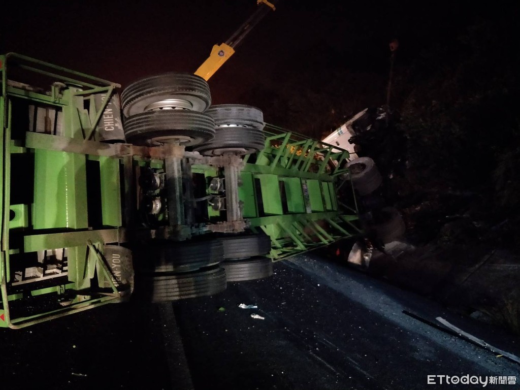 ▲22日凌晨3點時許,在國道三號北上84公里處發生連結車翻覆意外,駕駛夾困2小時後身亡。(圖/記者林妍君翻攝,下同)