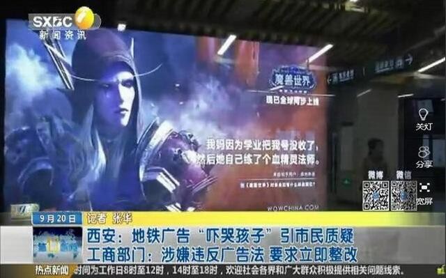 西安地鐵3號線地鐵站出現以「血精靈法師」為主題的《魔獸世界》廣告,由於主角希爾瓦娜斯女王形象過於恐怖,遭家長投訴把自己的孩子嚇哭,還有不少乘客都對質疑這幅海報形象過於血腥,眼睛流血的畫面會讓人不適,不應該出現在公共場合。