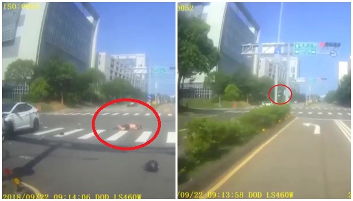 影片中可以看見,白色轎車的路口號誌燈已變紅燈,但它沒有減速,反而繼續直行,結果撞上機車騎士,強大撞擊力造成對方在空中旋轉一圈,3秒重摔倒地不動,連黑色安全帽都噴飛,傷勢看起來相當不樂觀,至於詳細肇事責任則還有待相關單位釐清。
