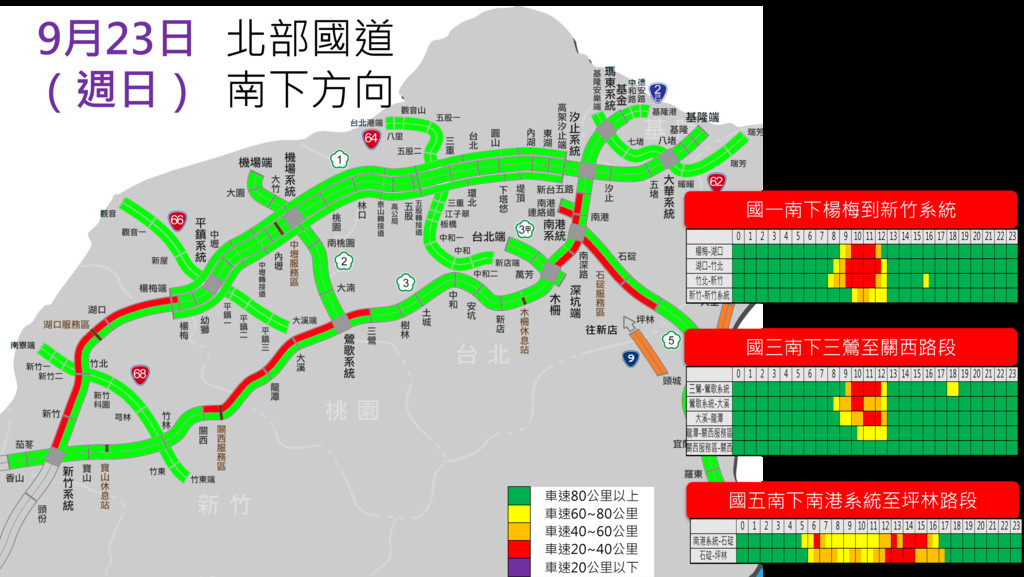 另外,高公局指出,中南部天氣較為良好,預估今日上午南下旅遊車潮也較多,將出現在國1南下楊梅至新竹系統、彰化系統至埔鹽系統,國3南下三鶯至關西、茄冬至西濱、烏日至霧峰及國5南下南港系統至坪林等路段。