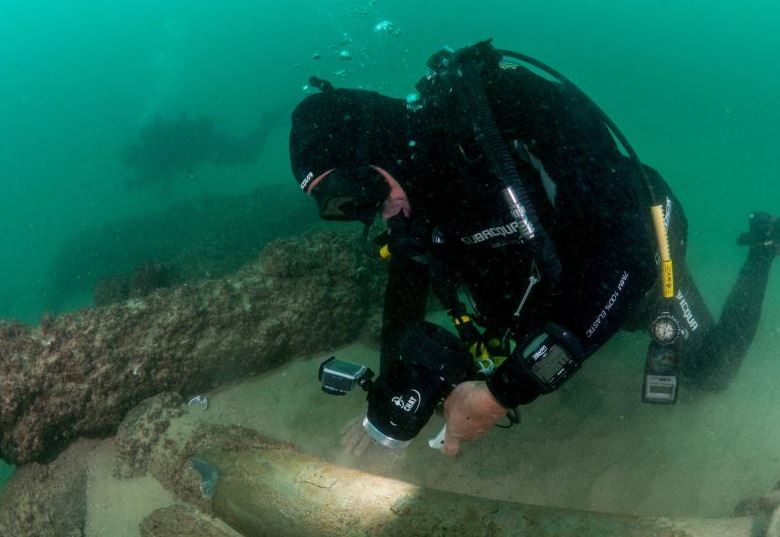 ▲ 沉船上發現一些青銅砲管,上面刻有葡萄牙國徽和環形球儀。(圖/翻攝nova_fcsh推特)