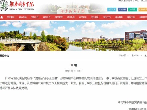 湖南一名大學新生在微博上自稱「貴州省省草王英俊」,多次發布「愛國是不可能愛國的,老子一輩子都不可能愛國」等言論,遭網友檢舉,當地政府及校方隨後也介入調查,將「王英俊」的入學資格取消。