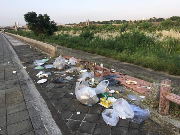 地點位在台中市太平河堤步道,照片中可以看見現場一片狼藉,疑似是當地居民在這邊烤肉後,垃圾沒帶走、廚餘沒包好、炭灰及磚頭也沒清,人爽爽吃完就離開現場,氣得目擊者怒說:「遠看以為是野狗咬來的垃圾,近看才發現是人類留下的痕跡……。」