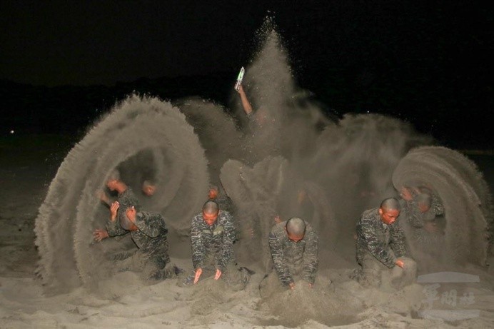 海軍陸戰隊兩棲偵搜專長班147期「20隻小蝌蚪」們在23日凌晨進行「格鬥戰技」課程。為了持續提振學員精神,課程前首先進行「沙漠風暴」,隨後這群小蝌蚪們屏氣凝神,反覆操練近身格鬥戰技,在無聲無息的夜幕中,持續默默地向「蛙人」目標挺進。