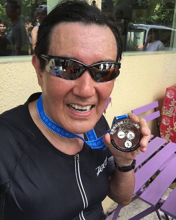 馬英九昨日完賽後在臉書分享好消息,照片中的他滿臉通紅、身穿緊身衣,手拿獎牌,引來網友留言,「偶第一次就獻給您了」。