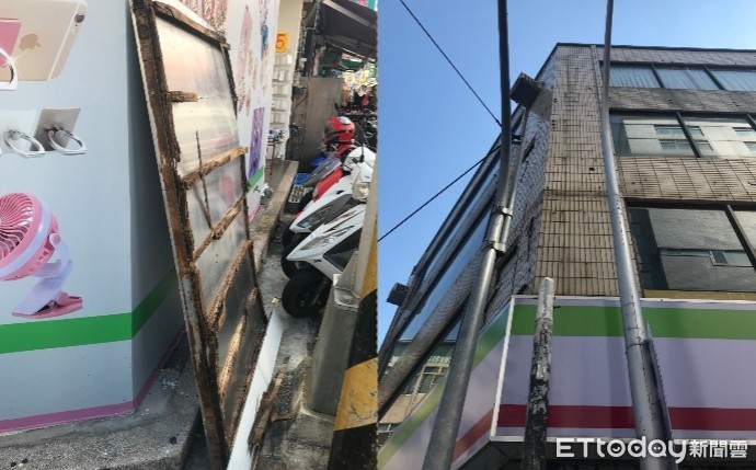 ▲男童被強風吹落的招牌打傷。(圖/記者陳玉攝)