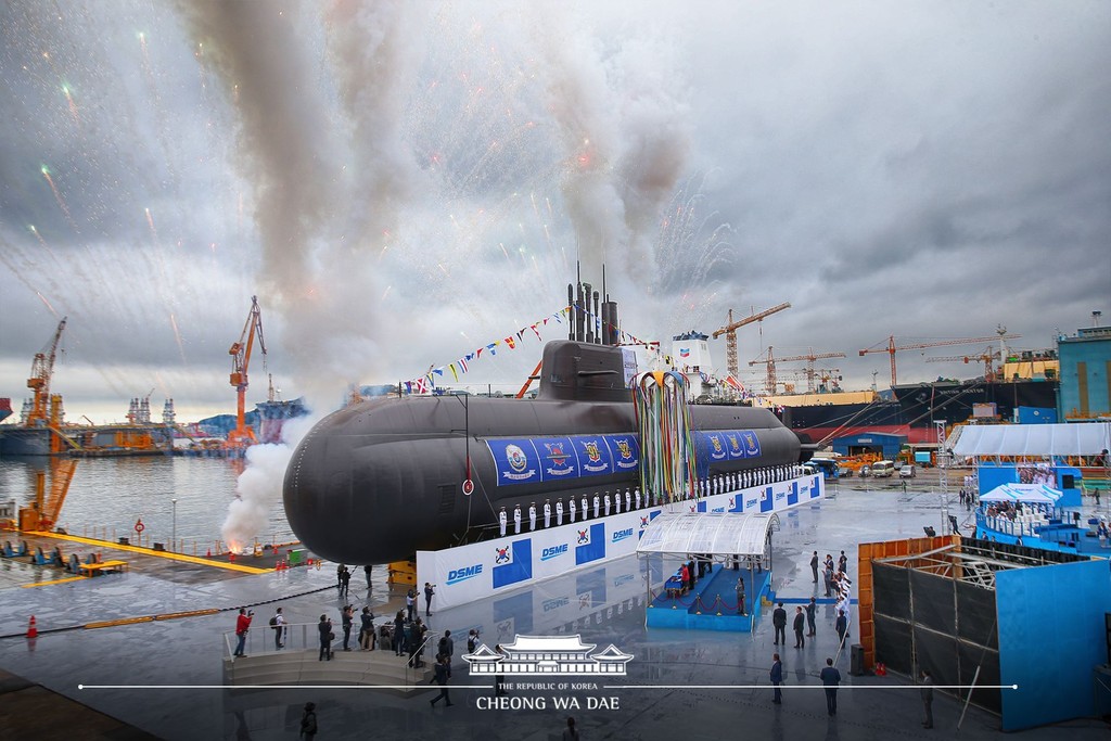 南韓海軍史上第一艘3000噸潛艇「島山安昌浩艦」,14日下午在大宇造船與海洋工程(DSME)的玉浦造船廠舉行下水儀式,總統文在寅夫婦及國防部官員、海軍參謀總長等軍方核心人士皆到場參與。