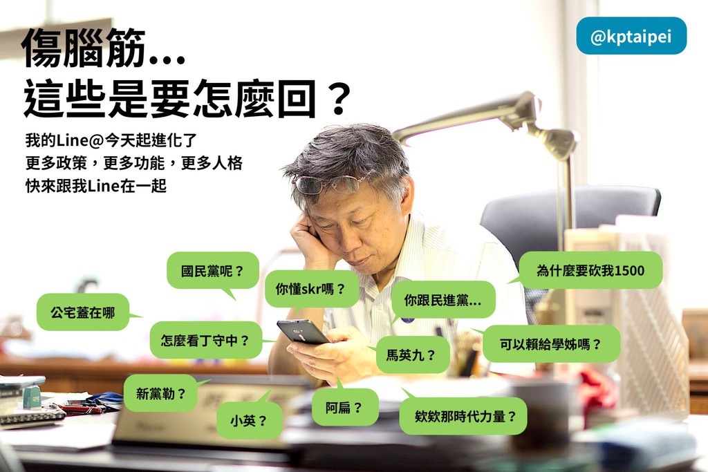 年底選戰逼近,台北市長柯文哲的LINE官方帳號再出奇招,民眾可以依照心情,選擇三種不同的角色當聊天對象,分別是「阿北」、「市長」以及「教授」。被問到老婆陳佩琪,柯文哲LINE神回覆,「我還是少說兩句好了」。