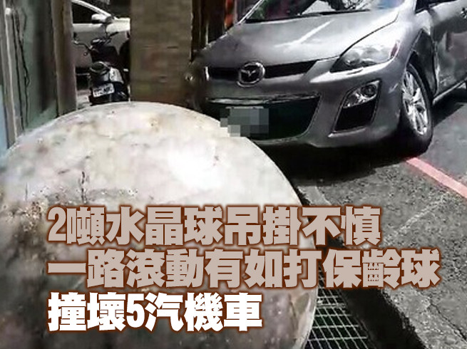 基隆市1名70多歲陳姓老翁,25日上午請吊車吊掛一顆2000公斤的水晶球,沒想到,在過程中突然整顆水晶球,從街道高處一路往下滾近200公尺,沿途撞倒多輛機車,最後撞上休旅車與民宅才停了下來,所幸現場沒有造成人員傷亡,因強烈撞擊,產生巨大聲響,引起許多鄰居及路人關心,目前正由轄區警方了解中。