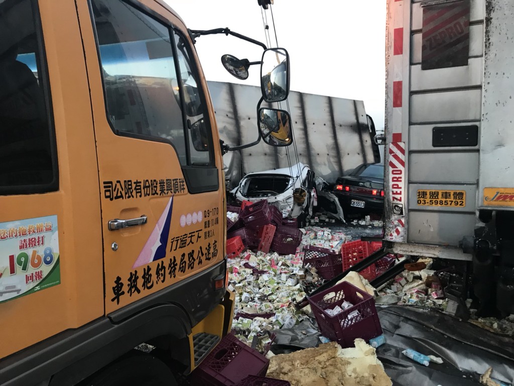 警消指出,車禍現場共有3輛大貨車、1輛小貨車及6輛自小客車連環追撞,且其中一輛大貨車翻覆倒在路中央,車體擠壓到前方的小車,導致車上一名男子受困。
