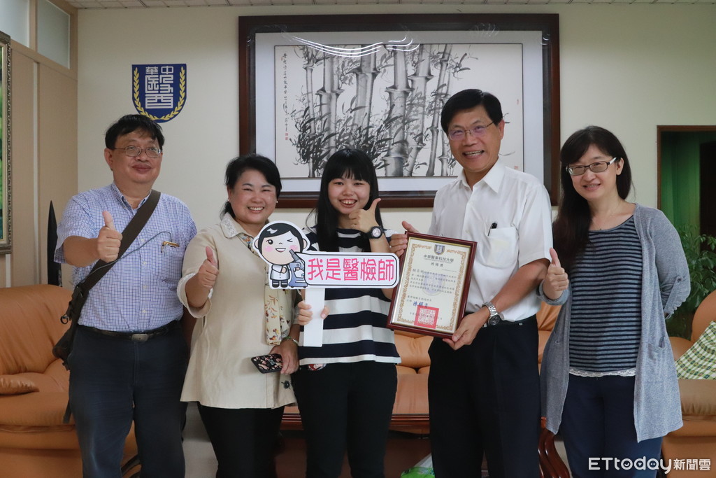 ▲不畏白血病折磨,通過國家醫檢師考試的中華醫大學生賴奕妡(中)在母親林吉仟(左二)陪同下接受校長曾信超(右二)和系主任陳明資(右一)、導師周以正(左)頒獎表揚。(圖/華醫提供)