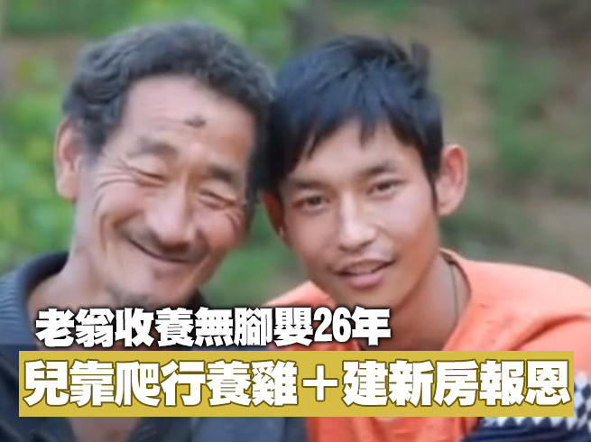 住在河南嵩縣老先生丁金栓,26年前收養「天生有尾巴」的棄嬰取名「丁轉成」,沒想到3歲了還不會走路,經過診斷發現,是患有「脊柱裂」,終身行走不便只能靠雙手爬行移動。如今孩子長大,靠養雞賺錢,還蓋起新房屋報答養育之恩。丁轉成說,「只要沒死就要好好活著,養活爸爸」。