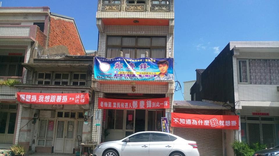 老梅路附近一排房屋有3戶門前都掛上紅布條,鄭慶鋒當時為了宣傳,在競選處門口拉起「老梅里里長候選人鄭慶鋒到此一拜」為了吸引經過的民眾多看幾眼,手法很常見,沒想到2戶隔壁鄰居見狀,興起惡搞玩心,也在自家門前掛起紅布條,大剌剌開嘲諷「隔壁掛,我想跟著掛。PS誠徵媳婦」、「不知道為什麼我就想掛」。