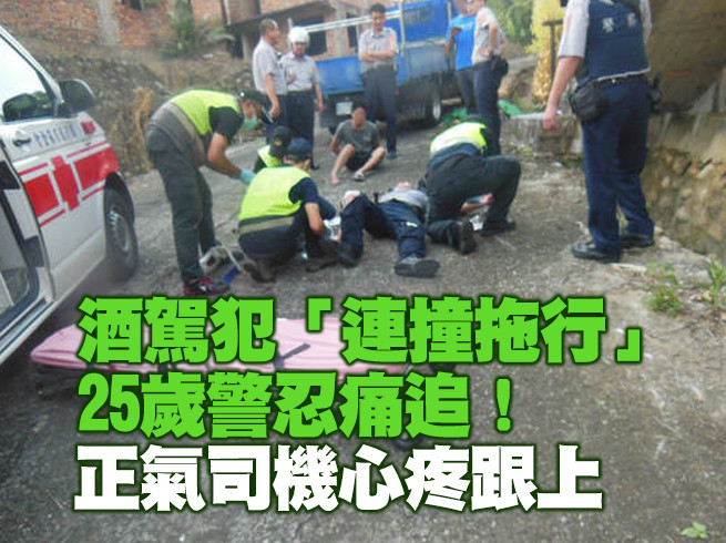 桃園大溪2名員警日前追捕酒駕通緝犯黃姓男子,他騎車落跑,警方一路追了10公里至新北三峽,對方拒檢還加速2度衝撞警車,當時一名路過的貨車司機目擊,25歲詹姓警員摔車遭拖行,還爬起來繼續追,正義感噴發,沿途跟著幫到底,最後將車擋在路中央攔截,黃男反應不及沒剎住撞上,當場被逮。