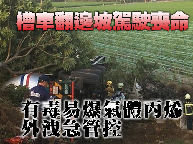 一輛滿載化學物「丙烯」的槽車南下,於中山高大林嘉義段不慎衝出護欄翻覆邊坡,由於車上滿載易燃化學物質丙烯,只見前往現場處理的警消不敢大意,先封鎖外側車道並持續對槽體灑水降溫,也陸續通知其他槽車到場接管,盡速將事故車內的丙烯抽取移除。
