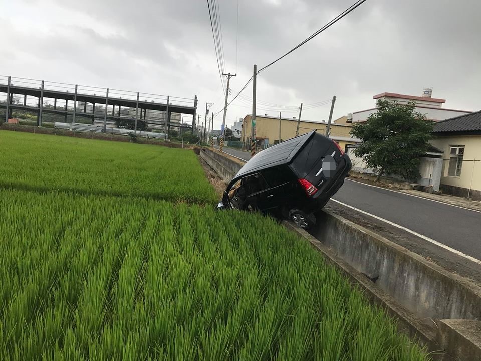 許姓送貨員今日(27日)上午8點30分行經新竹縣新豐鄉王爺橋替代道路,結果竟然看到一輛黑色豐田倒插在田邊,只剩下懸在半空中的右後輪沒有進到田裡,誇張的一幕讓他忍不住開玩笑稱之為「汽車特技『飛躍田間』」。