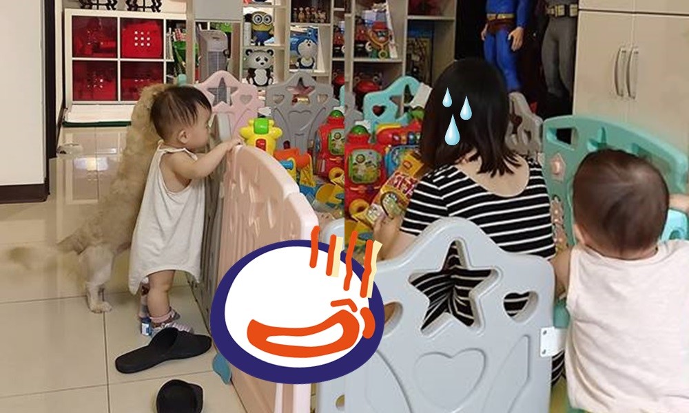 男網友在臉書《爆怨公社》表示,「自從為人母之後…連吃包零食都得把自己關在柵欄內!」並標註「老婆內心的爆怨」、「虎視眈眈」、「兩娃一犬」、「心酸的浪漫」、「片刻小確幸」等句子。