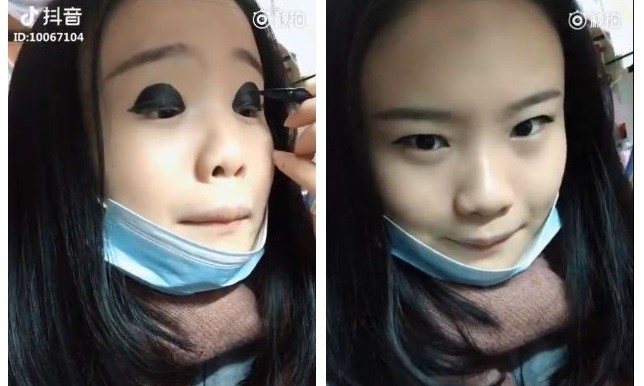 ▲女網友畫上超粗「熊貓眼線」。(圖/翻攝自抖音,下同)