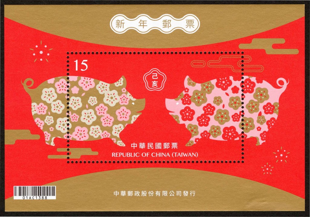 四、新年郵票(107年版):特種郵票,預定107年12月3日發行。以生肖-豬為題材,發行郵票1套2枚及小全張1張,郵票面值分別為6元及13元;小全張內含郵票面值15元1枚。