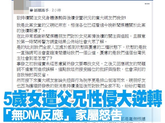 新北市一名5歲女童2日因下體流血,被醫師診斷出「疑似遭性侵」,更有護理師以女童自稱遭性侵的說法打臉父親的說詞,全案也跟著進入調查程序。有媒體報導,女童下體沒有驗出DNA,判斷不是遭到性侵,接著女童的父親更在網路PO文,提及已請律師蒐證完備。