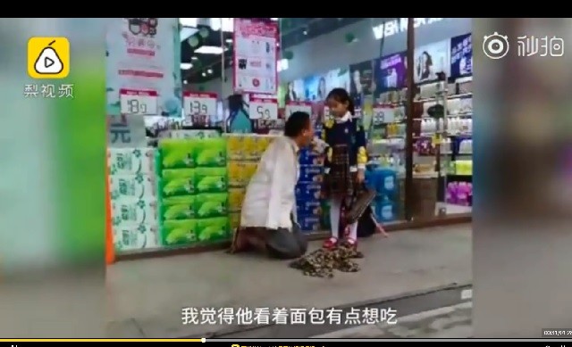 ▲小女孩餵流浪漢吃麵包 。(圖/翻攝自梨視頻,下同)