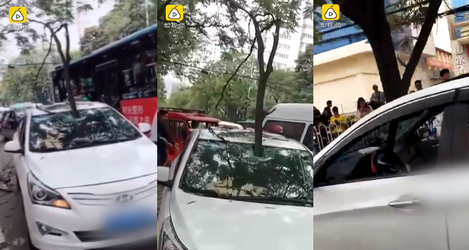 ▲樹幹穿過擋風玻璃把駕駛嚇壞。(圖/翻攝自梨視頻)