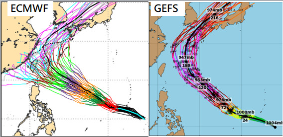 ▲28日20時歐洲模擬路徑(左)顯示,最東從琉球附近迴轉,最西則通過呂宋島北部近海,台灣在模擬路徑所通過的「不確定」範圍內。美國模擬路徑(右圖)顯示,最東的路徑從琉球東方迴轉,最西則通過石垣島迴轉。(圖/翻攝「三立準氣象·老大洩天機」)
