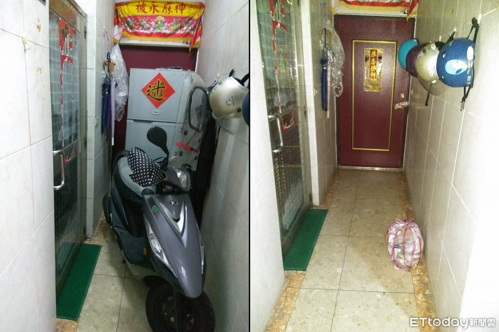 從原PO拍照畫面中可見,兩戶中的小走道已被塞到無路可走,冰箱、機車完美擋住紅門的去路,牆壁上還掛有多支雨傘、雨衣、安全帽,原本已狹小的空間變得更加擁擠,想要打開紅色的門十分困難。