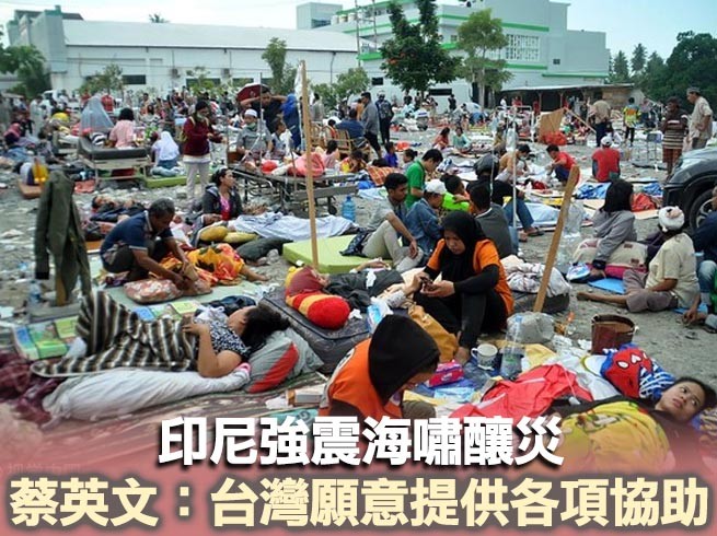 印尼東部蘇拉威西島28日連續發生淺層地震,下午3時許發生規模6.1地震,接著下午6時許又發生規模7.5強震,蘇拉威西首府帕盧(Palu)掀起3公尺高海嘯侵襲沿岸,洶湧海水直接把民宅淹沒沖垮,民眾驚恐四處奔逃,最新消息指至至少384人死亡,540人受傷。總統府29日表示,總統蔡英文很關心震災狀況,台灣也願意提供各項可能的協助。