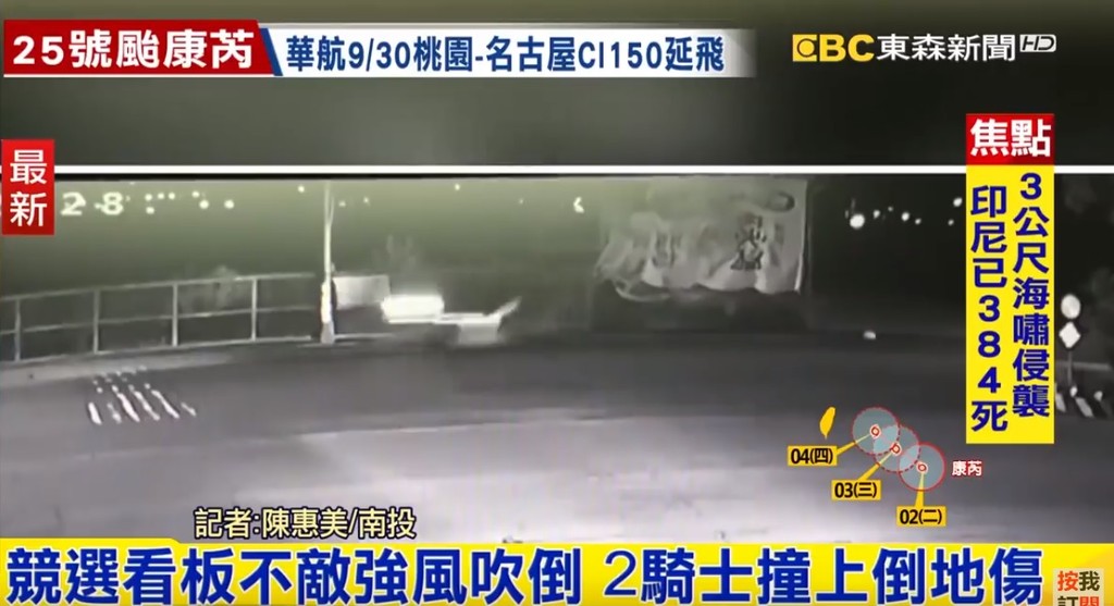 ▲南投草屯鎮長參選人競選看板遭強風吹垮,害2名騎士慘摔。(圖/東森新聞)