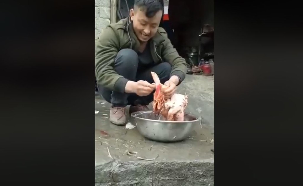 這段影片原先發布在中國社群媒體「快手」,最近被人分享至臉書上,從短短2分鐘不到的影片中可以看到,在一處民宅門前,一隻已經被拔毛的活雞從鐵盆中站了起來,半瞇雙眼、嘴巴咧開露出痛苦神情,這時身旁的人群突然發出讚嘆的叫聲及嘻笑聲,甚至還有人說到「你看看你這雞毛都拔完,雞還站起來!」