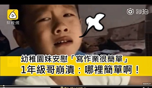 浙江麗水剛升1年級的程弟弟近日被回家功課弄到崩潰,沒想到就讀幼稚園的妹妹還補一刀,「哥哥認真點,作業很簡單的!」他當時已經寫完作業,但一聽到小妹妹這麼一說,怒火瞬間被點燃並崩潰大喊,「哪裡簡單啊!」