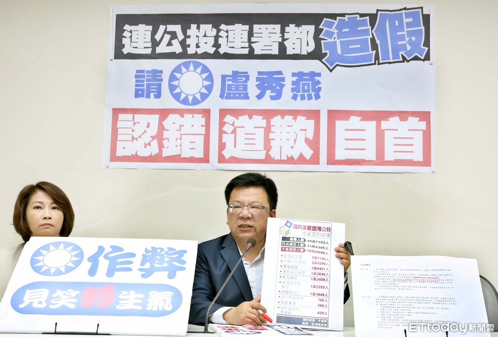 國民黨「反空汙公投」被指不合格連署份數49.4%造假,中選會2日將召開委員會審議是否成案。國民黨發言人1日表示,中選會指稱有1萬1000份死人連署,數量恰好與多出來的連署書相同,合理懷疑就是中選會應塞進來要影響藍營公投案的產生。對此,民進黨團開記者會反擊,黨團幹事長李俊俋超酸地說,國民黨要提告查得很認真的市政府,就像「學生作弊還要告老師,有這樣的道理嗎?」