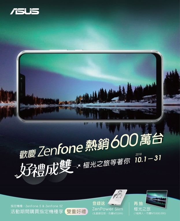 為此,華碩宣布祭出優惠活動,即日起至10月31日以前,凡購買ASUS ZenFone 5 / ZenFone 5Z等指定機種,並前往官方活動網站進行線上登錄,不僅可獲得獨家「孔劉限定版ASUS ZenPower Slim行動電源 (市價NT$399 )」,還有機會抽中「雙人極光之旅 (市價NT$ 300,000,共1組)」。