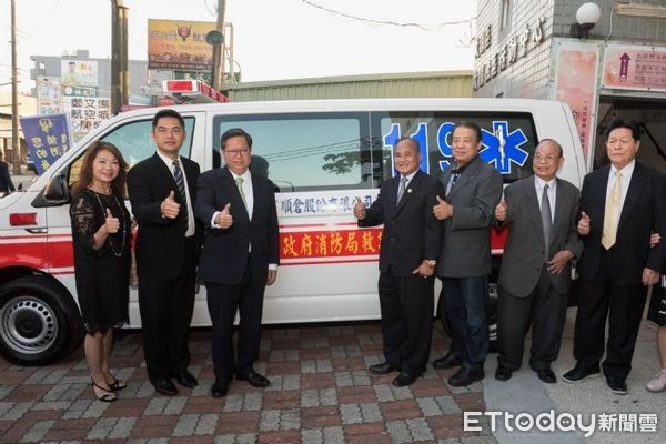 長期關注消防安全議題的桃園市大園區順倉公司,1日於大園里活動中心,由董事長潘榮茂捐贈一輛350萬救護車給市府消防局,由市長鄭文燦、消防局長謝呂泉代表接受。鄭文燦指出,大園區人口激增,現今已有9萬多人,順倉捐贈的救護車有許多新式設備,有助提升大園分隊的救護能量。