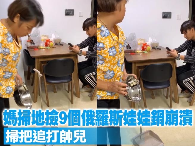 「俄羅斯娃娃鍋子」整到老媽抓狂!一名帥哥兒子故意惡作劇,氣得掃地的媽媽拿掃把要教訓他。網友笑說,「後面最好笑,母子都是好身手!」