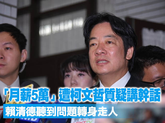 月薪4.8萬風波又惹議!台北市長柯文哲日前受訪指出,「平均工資5萬,開什麼玩笑?」引來行政院副發言人丁允恭趕緊解釋,此一數字是包含年終、績效等非按月發放的獎金,而非只有平常的月薪;行政院長賴清德2日赴立法院備詢被問到此題,原先侃侃而談聊空汙將近5分鐘的他,突然說謝謝就轉身走人,不回應幹話等批評。