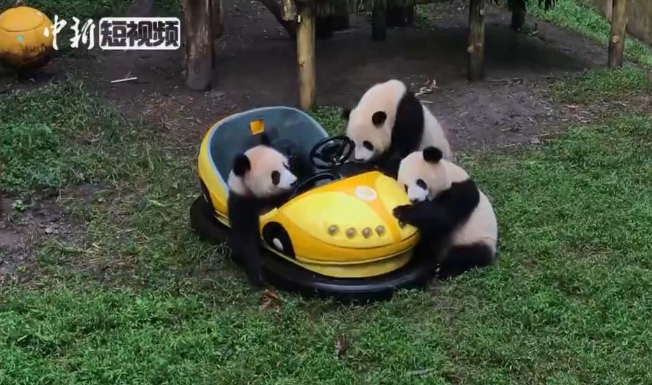 重慶動物園大熊貓館裡的熊貓寶寶近日又收到新玩具「碰碰車」了。只見3熊貓「渝寶」、「渝貝」和「良玥」爭先恐後地上前將玩具車給包圍,彷彿看見稀有寶物似地仔細摸索著,不一會兒就擺出「老司機」架式,還露出一臉滿意的模樣,想必當時牠們簡直樂壞了。