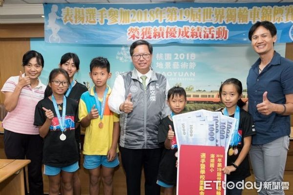 獨輪車運動是桃園的地方特色運動之一,桃園市獨輪車委員會在今年7月前往韓國參加第19屆世界獨輪車錦標賽,成績輝煌、再次為國增光,市長鄭文燦今天兌現先前「加碼」的承諾,由獨輪車委員會主委曾文敬陪同,在市府接見得獎團隊和全體騎手,頒發績優獎金給獲獎騎手,鼓勵桃園獨輪車運動,繼續前進國際。