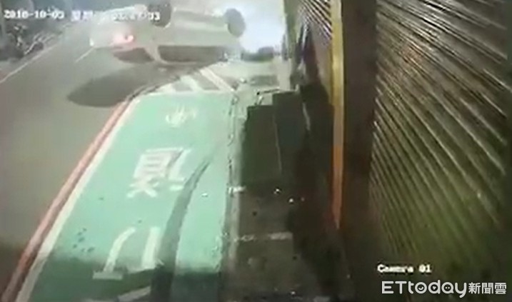 警方在現場查看,現場除了造成一家店面受損外,停在路邊停車格的自小客車及機車,也受到波及,被翻覆的轎車推撞。附近店家老闆瞄到監視器畫面,嚇了一跳,急忙到現場查看店門口的受損情況。而監視器畫面顯示,轎車行徑路線當時閃黃燈,機車行駛路口閃紅燈,責任歸屬還在調查。