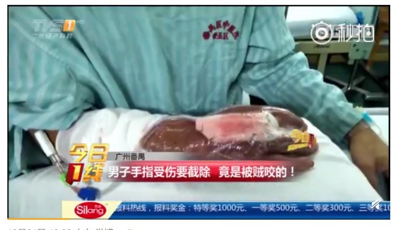 ▲手指被小偷咬傷,竟然引發細菌感染。(圖/翻攝自《廣東廣播電視台》的微博)