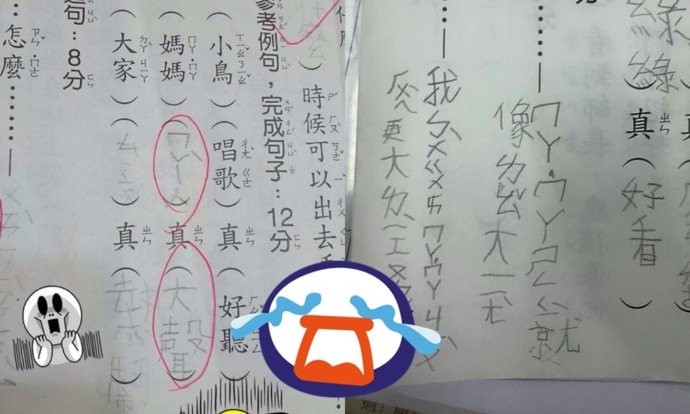 女網友在臉書《爆怨公社》貼出作業的照片,只見題目是參考例句完成句子,範例是「小鳥唱歌真好聽」,題目則是「媽媽OO真XX」,沒想到兒子竟寫下「媽媽ㄇㄚˋ(罵)人真大聲」,而且已經是訂正過的回答。原PO無奈地說,「#誰來教教我怎麼小聲罵人」、「#下次藤條在手一句都沒有」、「不想知道臭小子訂正答案前寫了媽媽什麼…我一點也不想知道」。