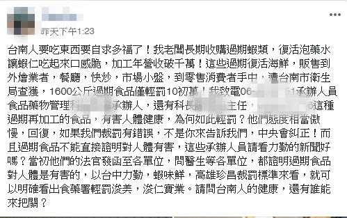 網友在10月2日下午PO文指出:「台南人要吃東西要自求多福了!我老闆長期收購過期蝦類,復活泡藥水讓蝦仁吃起來口感脆,加工年營收破千萬!這些過期復活海鮮,販售到外燴業者,餐廳,快炒,市場小盤,到零售消費者手中,遭台南市衛生局查獲,1600公斤過期食品僅輕罰10初萬!我致電承辦人員食品藥物管理科,還有科長,這種過期再加工的食品,有害人體健康,為何如此輕罰?他們態度相當傲慢,回復,如果我們裁罰有錯誤,不是你來告訴我們,中央會糾正!而且過期食品不能直接證明對人體有害,這些承辦人員請看力勤的新聞好嗎?當初他們的法官發函至各單位,問醫生等各單位,都證明過期食品對人體是有害的,以台中力勤,蝦味鮮,高雄珍昌裁罰標準來看,就可以明確看出食藥署輕罰業者。請問台南人的健康,還有誰能來把關?」。