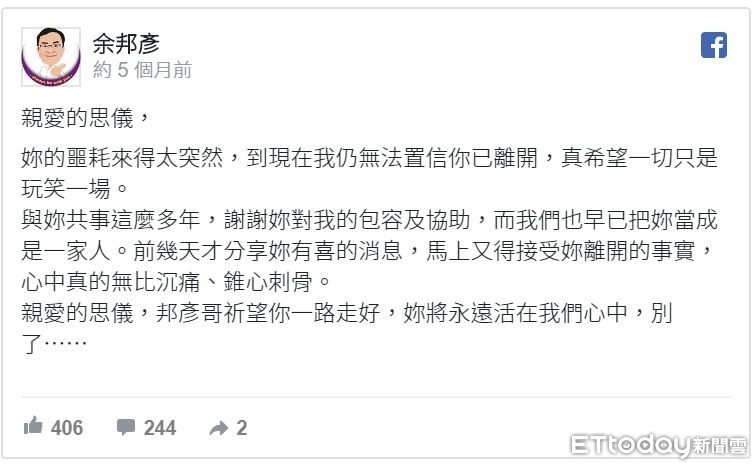 ▲余邦彥在臉書寫下對李助理的不捨心情。(圖/翻攝畫面)